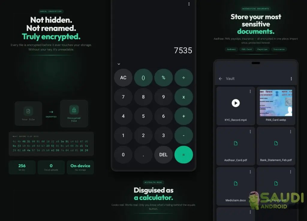 التطبيق يعمل كخزنة رقمية (Vault) لتخزين “الصور، الفيديوهات، الملفات والمستندات”، لكن المميز هنا أنه ليس مجرد إخفاء… بل تشفير فعلي للملفات داخل الجهاز، كما يمكن إخفاء التطبيق نفسه على شكل آلة حاسبة سرية لزيادة الخصوصية.